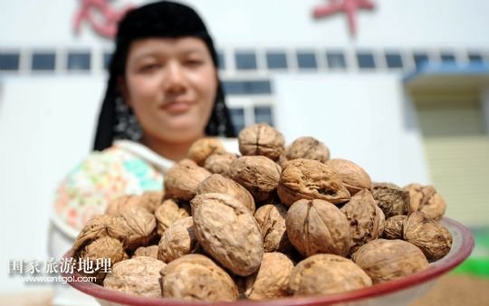 循化縣石頭坡村的撒拉族村民韓哈奇美在展示薄皮核桃(9月17日攝)。