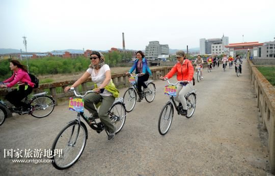 國(guó)家旅游地理 吉林延邊5月4日訊 中國(guó)游客騎車(chē)通過(guò)吉林圖們口岸進(jìn)入朝鮮境內(nèi)(5月2日攝)。位于中朝邊境的吉林省延邊州圖們市5月2日正式開(kāi)通首條中朝跨境騎行游線路。按照線路行程,中國(guó)游客于早8點(diǎn)在圖們市公安局出入境管理大廳辦理赴朝旅游通行證,后經(jīng)圖們公路口岸騎行過(guò)境到朝鮮南陽(yáng),參觀朝鮮南陽(yáng)火車(chē)站、永生塔、南陽(yáng)國(guó)際旅館、朝鮮小型農(nóng)貿(mào)市場(chǎng)后回國(guó),全程約6個(gè)小時(shí)。 /新華社發(fā)(吳然 攝)
