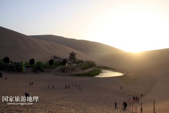 國(guó)家旅游地理 甘肅酒泉5月19日訊 夕陽(yáng)下的甘肅省敦煌市鳴沙山月牙泉顯得更加迷人(5月18日攝)。初夏時(shí)節(jié),甘肅省敦煌市鳴沙山月牙泉景區(qū)風(fēng)光秀美,吸引眾多中外游客前來(lái)觀光游覽。 新華社發(fā)(張曉亮 攝)