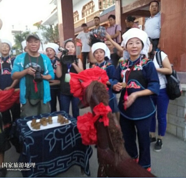 這是黔南惠水縣好花紅布依風(fēng)情寨,為了歡迎遠(yuǎn)方客人的到來(lái),布依族人在寨門(mén)前擺滿酒杯唱起山歌。在進(jìn)寨前客人都要喝三杯攔門(mén)酒,喝完才能進(jìn)入寨中。同時(shí),布依族習(xí)俗中,遠(yuǎn)方客人到來(lái),坐上木馬,喝完三杯米酒也寓意著會(huì)交好運(yùn)。